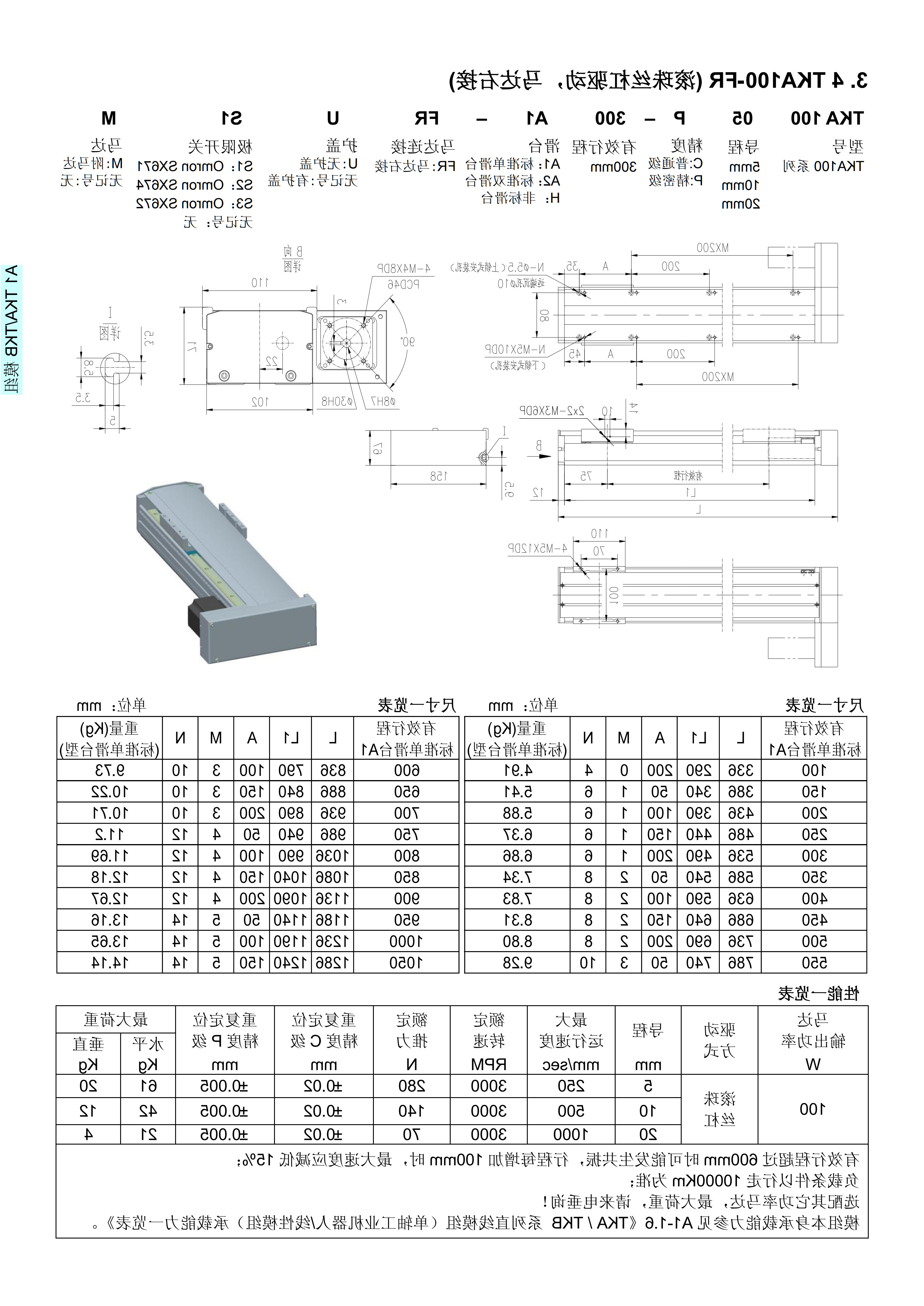 公司专业生产的线性模组(直线模组,直线滑台),安装尺寸国际通用,精选台湾进口上银滚动直线导轨和TBI滚珠丝杠搭建,质量优,供货快。TKA系列线性模组为铝基座,宽度范围90mm到200mm,滚珠丝杠传动,完全替代台湾上银KA系列,性能等同日本IAI,台湾Toyo等著名品牌。
