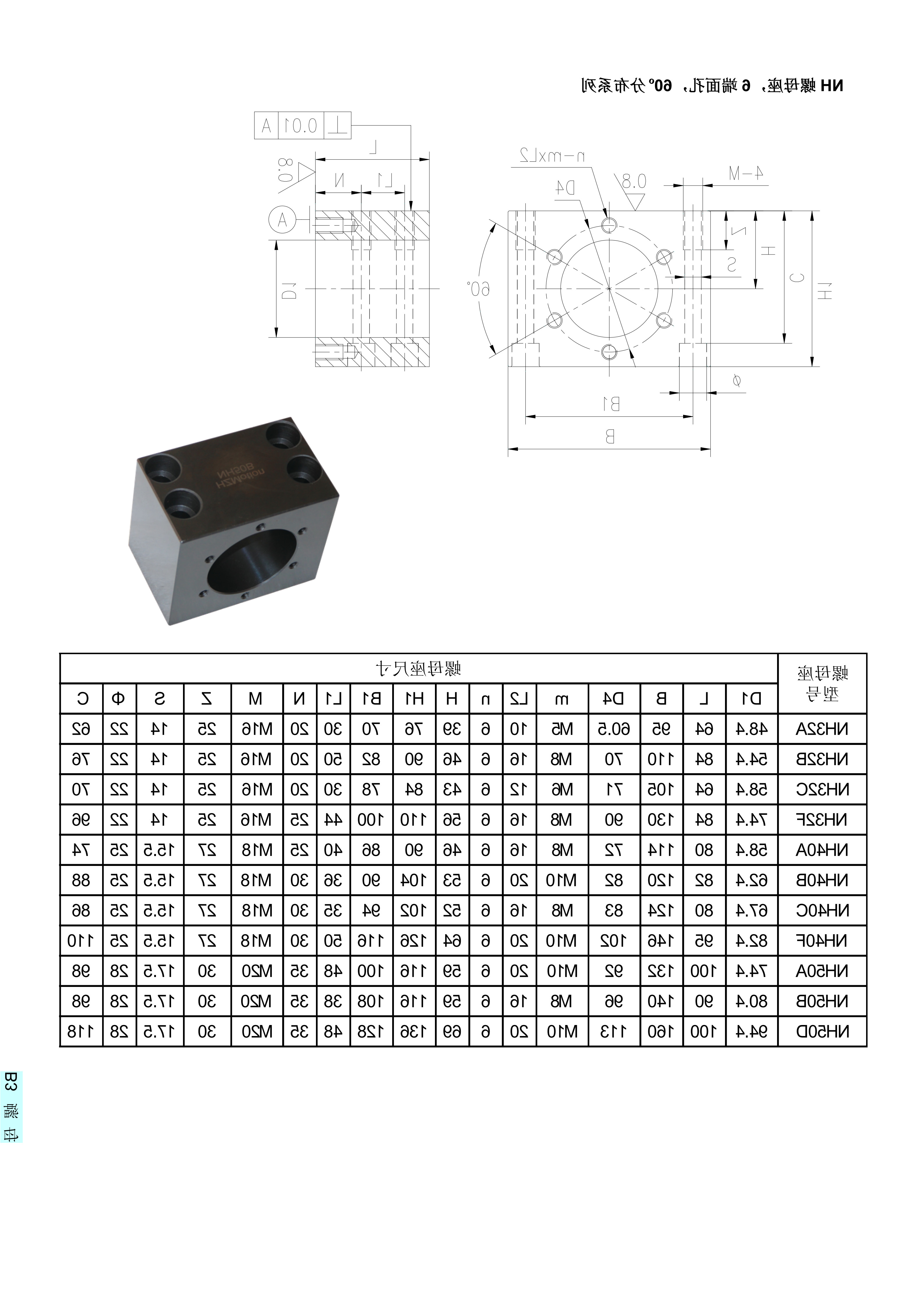 公司研发和生产全型号世界著名厂商的滚珠丝杠专用螺母承座,特别是MGD/MGS系列,其安装尺寸完全匹配标准化轧制滚珠丝杠螺母。各产品型号与台湾嵩阳SYK,日本THK,日本NSK,MISUMI,德国Rexroth相应型号通用。NH系列为我公司国际首创,在汇总了国际著名滚珠丝杠生产商螺母标准的基础上,推出了各厂商间通用的螺母座安装尺寸。MH螺母座,6端面孔,60°分布系列具体型号:NH32A、NH32B、NH32C、NH32F、NH40A、NH40B、NH40C、NH40F、NH50A、NH50B、NH50D.