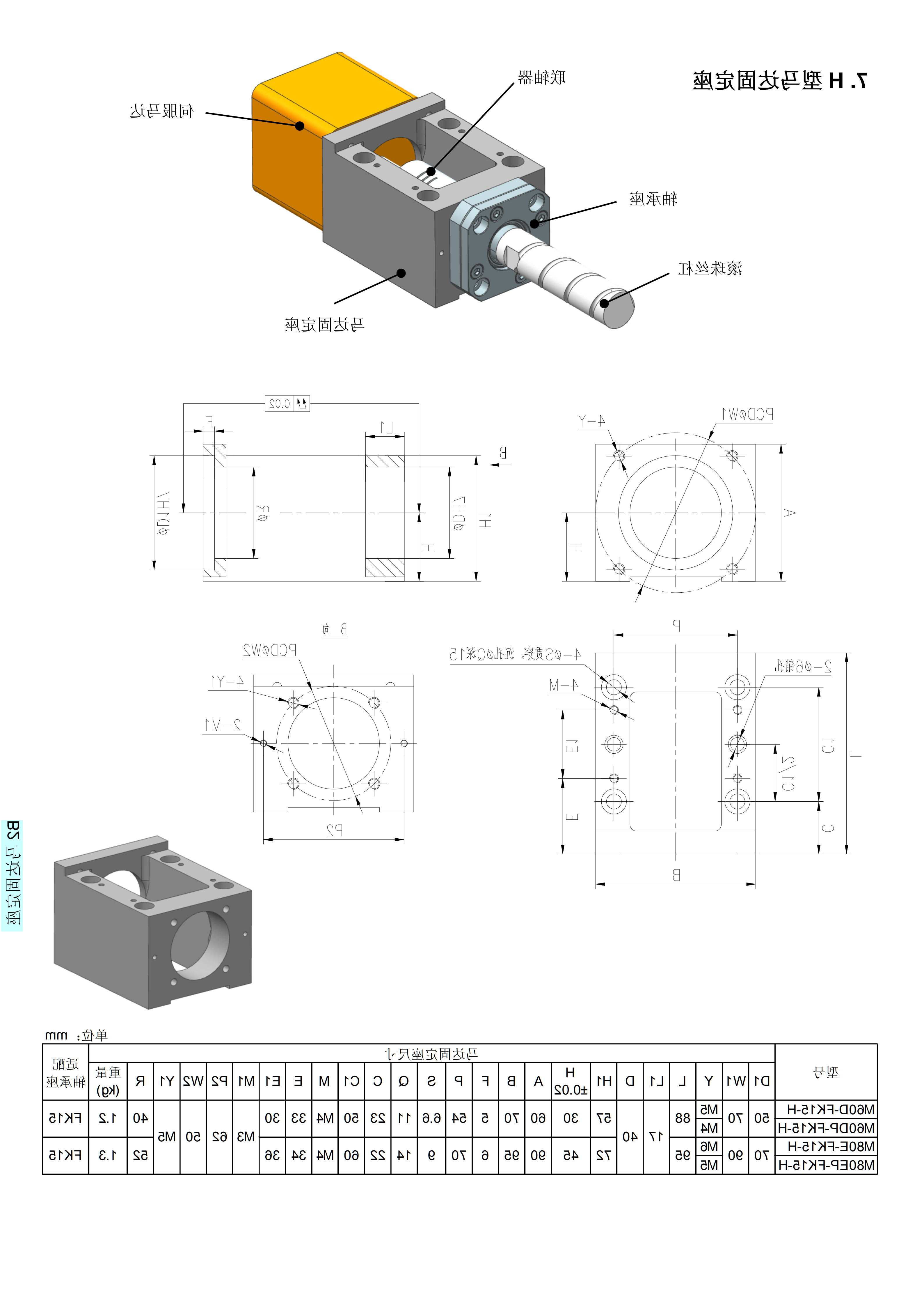 公司研发和生产的马达固定座,马达端可适应松下,三菱,台达,东方等著名厂商的伺服马达/步进马达,轴承座一端适用国际标准化轴承座,从而,马达安装与滚珠丝杠可保证同心,提高安装效率与安装质量。A型,B型,C型,H型,L型与台湾嵩阳SYK相应型号通用;KK型等同台湾上银KK系列,PMI之KM系列,日本THK之KR/SKR等线性模的固定端。H型马达座具体型号:M60D-FK15-H、M60DP-FK15-H、M80E-FK15-H、M80EP-FK15-H。